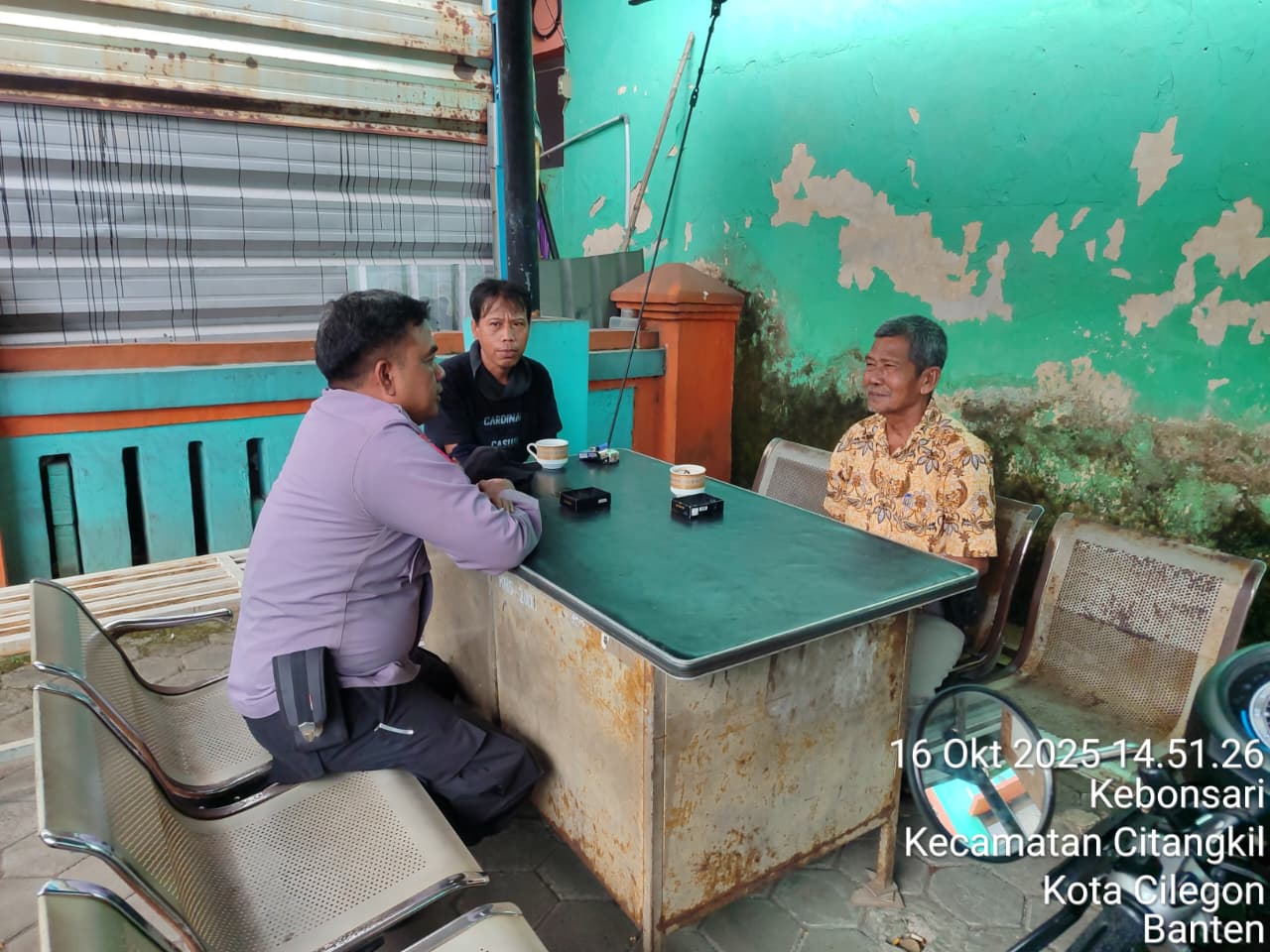 Cilegon - Personil Bhabinkamtibmas Polsek Ciwandan Polres Cilegon Polda Banten Menyampaikan Pesan Kamtibmas dan mengajak masyarakat terus aktif dalam kepedulian terhadap Pemeliharaan keamanan lingkungan di daerah Binaanya, Kamis (16/10/2025).