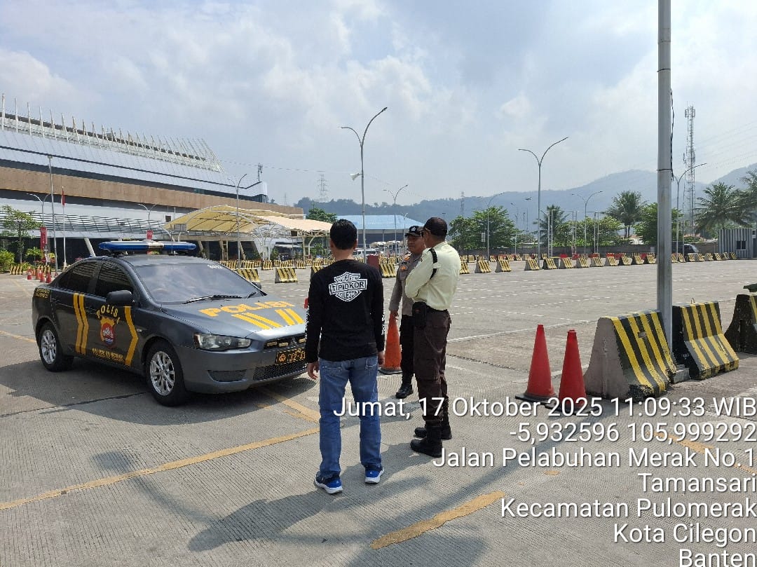 Cilegon - Personel Polsek Kskp Merak Polres Cilegon Polda Banten melaksanakan sambang dan patroli kawasan pelabuhan merak dalam rangka menjaga Harkamtibmas di Kawasan Pelabuhan Merak, Jumat (17/10/2025).