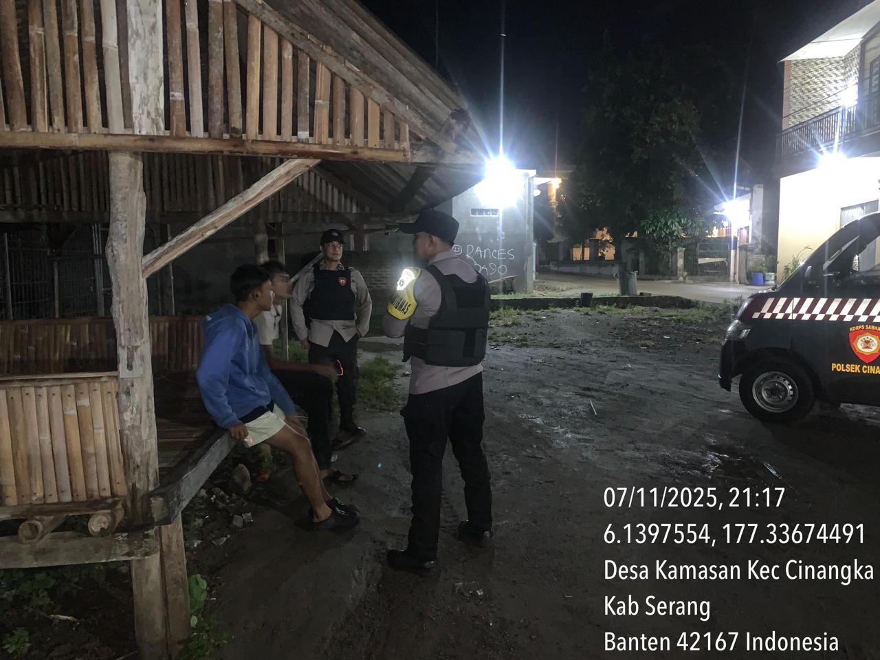 *Polres Cilegon* || Personel Bhabinkamtibmas Polsek Cinangka melaksanakan Program Komandan Wish Kapolda Banten RONDA SATKAMLING menyampaikan komunikasi dengan Petugas Siskamling agar berperan aktif dalam menciptakan Harkamtibmas yang aman dan Kondusif, Sabtu (08/11/2025).