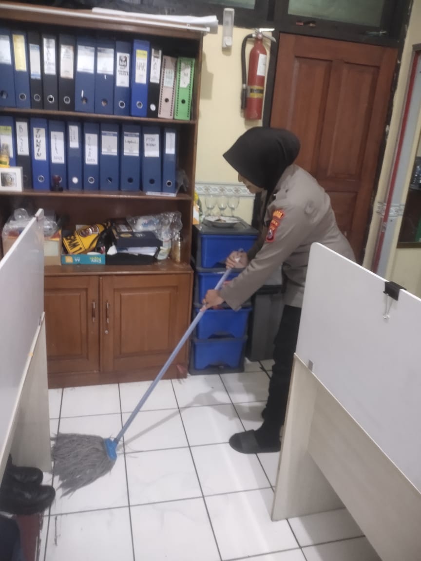 Anggota Bag SDM Polres Cilegon, selalu aktif melakukaan aktivias rutin dalam membersihkan ruangan kerja.