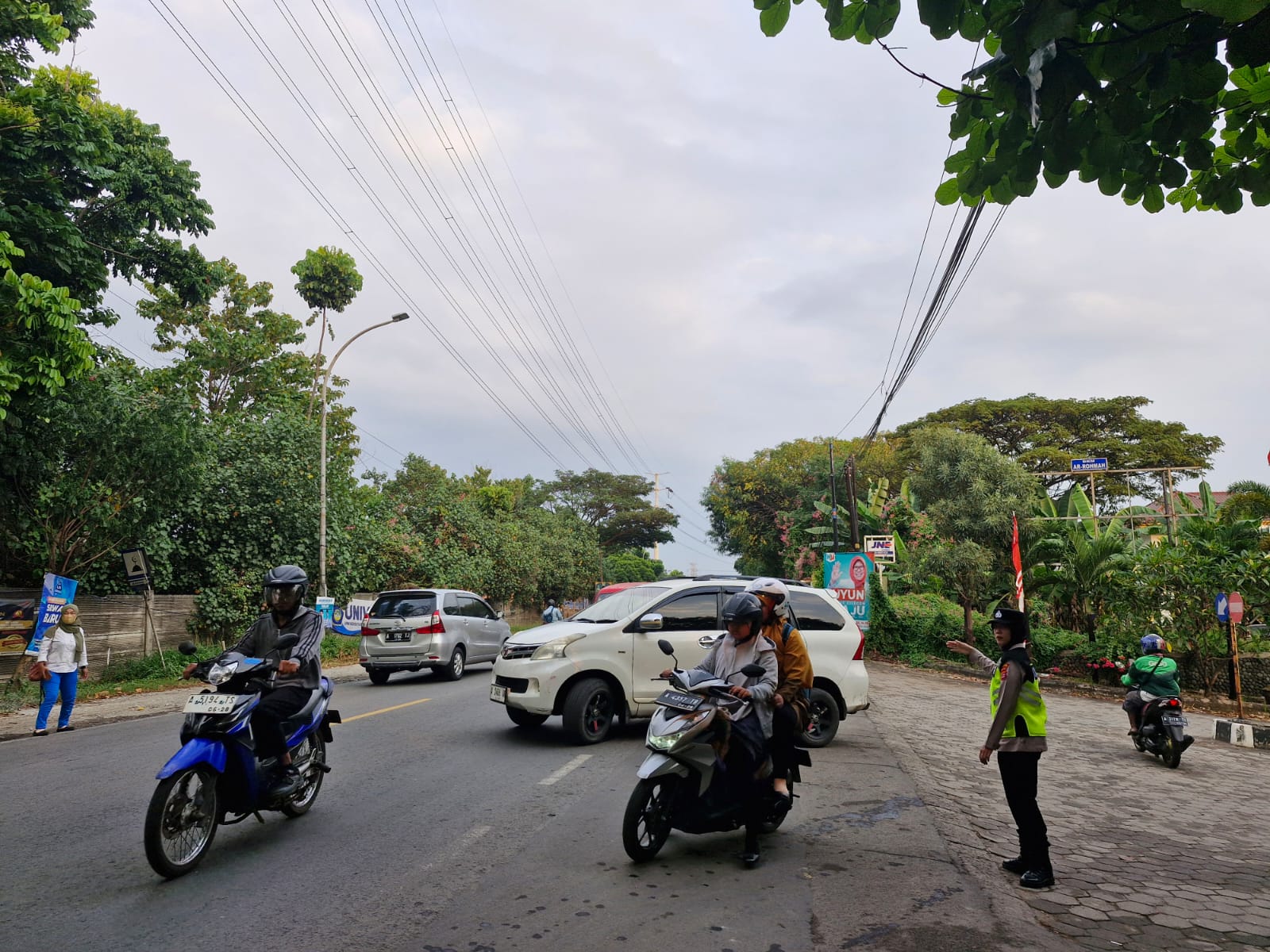 Personil Polwan Cilegon Polda Banten Aipda Emi Prasetyo Melaksanakan kegiatan Pelayanan pengaturan Arus Lalin / strong point di Jalur Depan Perumahan Arga Baja Pura Kota Cilegon
