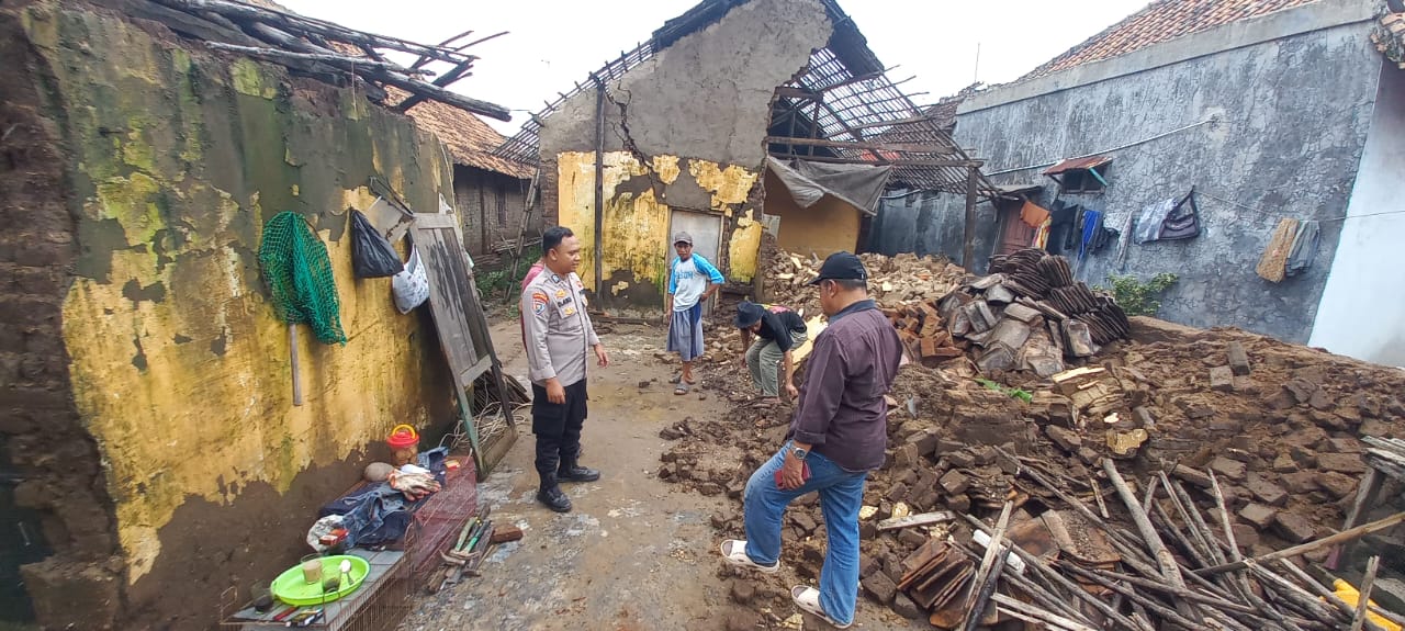 Cilegon - Bhabinkamtibmas Kelurahan Tegal Ratu, Brigadir Dede Abu, langsung melakukan pengecekan ke lokasi kejadian rumah rubuh di Lingkungan Kubang Saron RT 004 RW 002 Kelurahan Tegal Ratu Kecamatan Ciwandan Kota Cilegon.