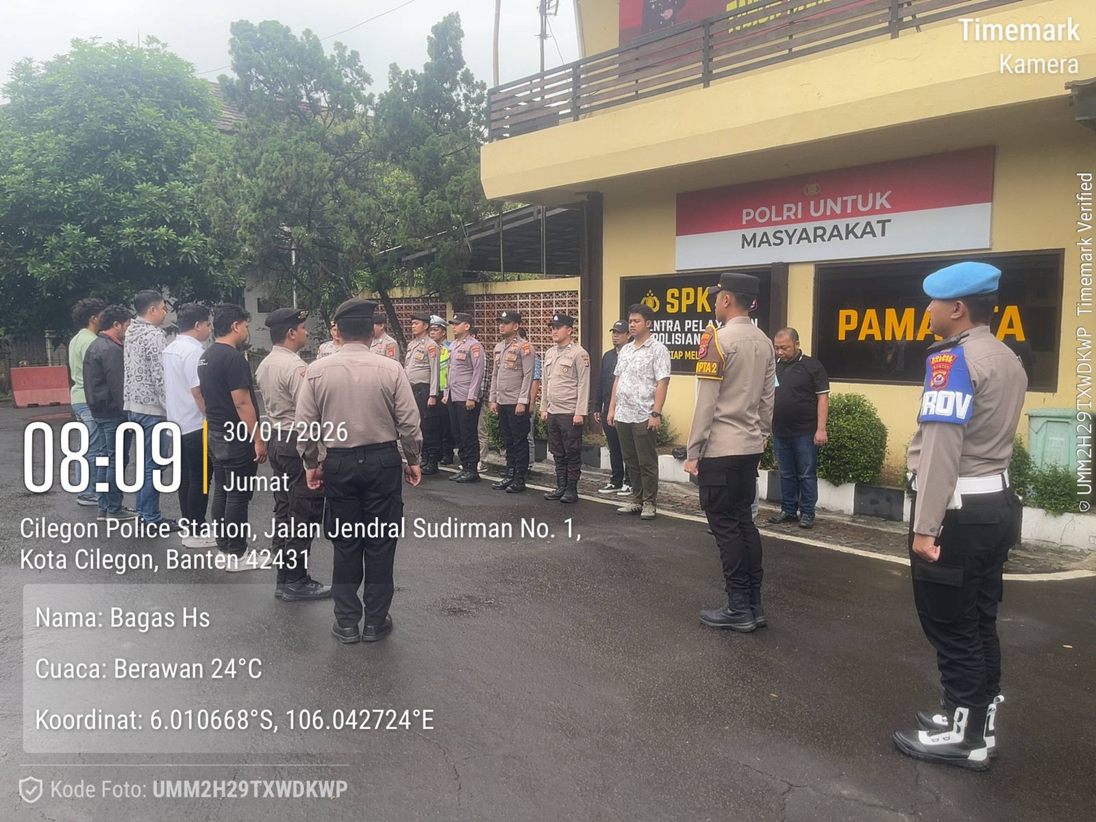 Cilegon, personel Satreskrim Polres Cilegon Polda Banten melaksanakan piket di penjagaan pintu masuk Polres Cilegon Polda Banten untuk memastikan mako Polres Cilegon dalam keadaan aman dan nyaman dalam melayani Masyarakat. Jumat (30 /01/2026).