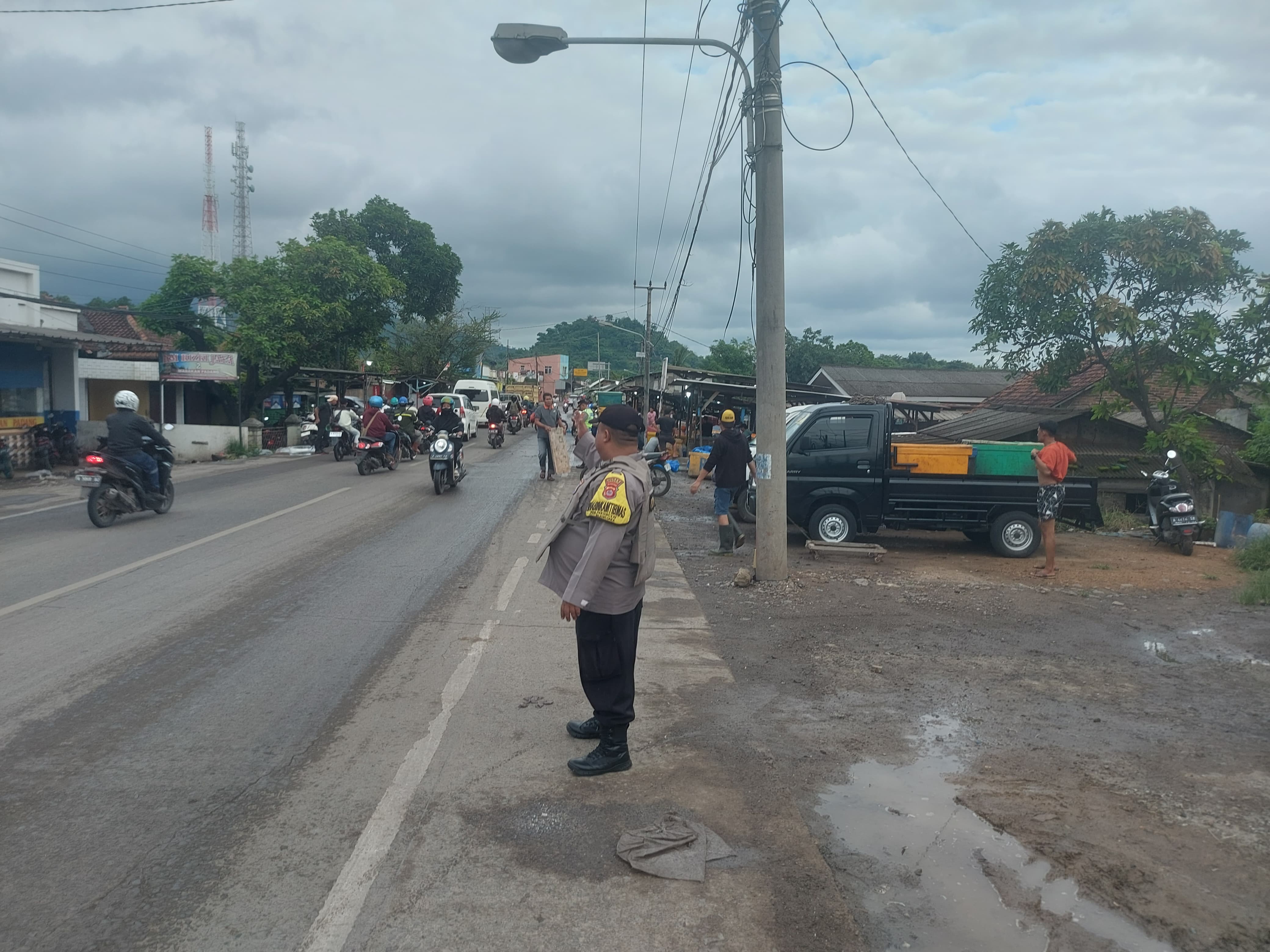 Bripka Tri Handoko dan Bripka Heru Bhabinkamtibmas Bantu Lancarkan Lalin Di Simpang Jalan Raya Wadas Bojonegara