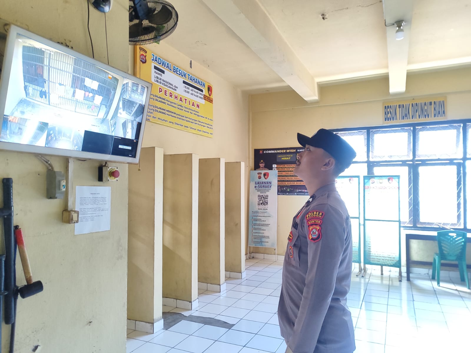Personil Sat Tahti Cek Tahanan melalui CCTV yang ada di Rutan Polres Cilegon.