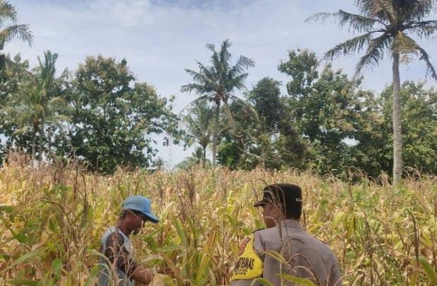 Dalam kegiatan monitoring ini, Bhabinkamtibmas meninjau langsung kondisi lahan jagung.
