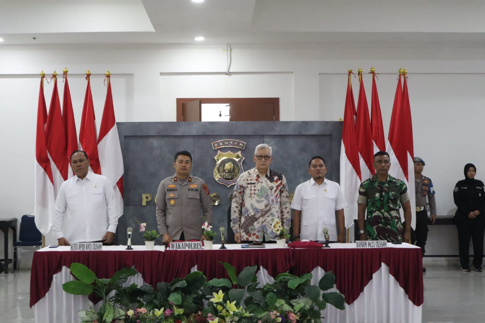 Rapat koordinasi dilaksanakan di bawah penanggung jawab Kapolres Cilegon AKBP Dr. Martua Raja Taripar Laut Silitonga, S.H., S.I.K., M.Si. Kegiatan turut dihadiri Wakapolres Cilegon KOMPOL M. Ridzky Salatun, S.I.K., Wakil Ketua I DPRD Kota Cilegon H. Sohidin, S.H., Wakil Ketua II DPRD Kota Cilegon H. Masduki, Asda II Kota Cilegon H. Dana Sujaksani, S.Sos., M.Si., Danramil Cilegon Mayor Inf Usman, Plt Kadis Ketahanan Pangan Kota Cilegon Novi Yogi, Sekjen MUI Kota Cilegon H. Sutisna Abas, Ketua MUI Kabupaten Serang H. Muhit, Ketua FKUB Kabupaten Serang KH. Komarudin, Head Operation ASDP Merak I Putu Widhiyatamaja, Jr Officer Sc PT Pertamina Tanjung Gerem Achtizen, para PJU Polres Cilegon, Kapolsek jajaran Polres Cilegon, perwakilan SKPD Kota Cilegon, pimpinan instansi terkait, serta pimpinan organisasi keagamaan.